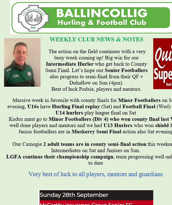 Ballincollig Club Newsletter for 39th week of 2025 is now at https://tinyurl.com/2025-Wk39 or on our website https://ballincolliggaa.clubzap.com/articles