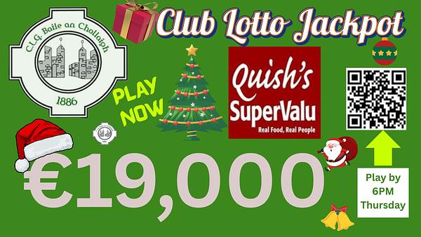 ☘️ Our Lotto Jackpot is Now €19,000 💶 Play before Thursday 6pm on Clubzap. Best of Luck to all Players 🌈 Play now on the ClubZap app (Clubhouse -> Lotto) OR optionally play at the link here or direct link here https://ballincolliggaa.clubzap.com/draws