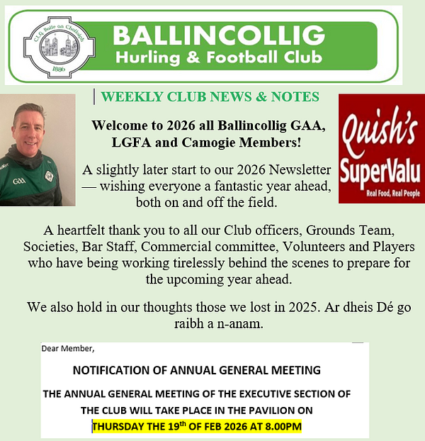 Ballincollig Club Newsletter for 5th week of 2026 is now at https://tinyurl.com/2026-Wk05 or on our website https://ballincolliggaa.clubzap.com/articles