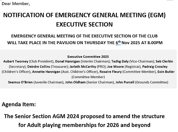 | Executive Committee 2025 Aubert Twomey (Club President), Donal Hannigan (Interim Chairman); Tadhg Daly (Vice-Chairman); Seb Clerkin (Secretary); Deirdre Collins (Treasurer); Jarlath McCarthy (PRO); Joe Moore (Registrar), Padraig Crowley (Children’s Officer), Annette Hannigan (Asst. Children’s Officer), Rosaire Fleury (Committee Member), Eoin Butler (Committee Member)