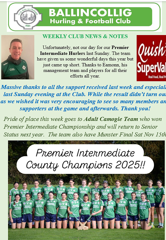 Ballincollig Club Newsletter for 43rd week of 2025 is now at https://tinyurl.com/2025-Wk43 or on our website https://ballincolliggaa.clubzap.com/articles